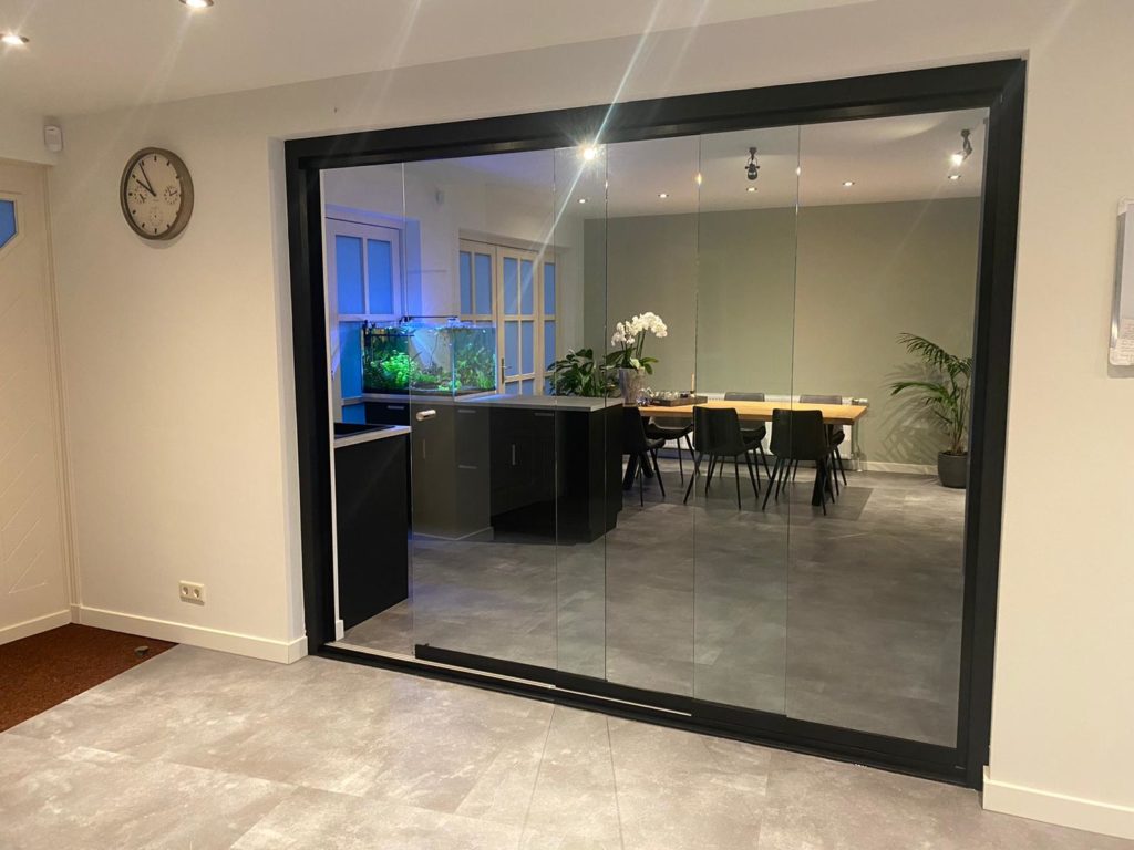 Glazen wanden bieden een elegante manier om een ruimte af te scheiden terwijl het doorzicht en het natuurlijke licht behouden blijven. Deze wanden worden geplaatst in een onder- en bovenprofiel, wat zorgt voor stabiliteit zonder het ruimtelijke gevoel te verstoren.